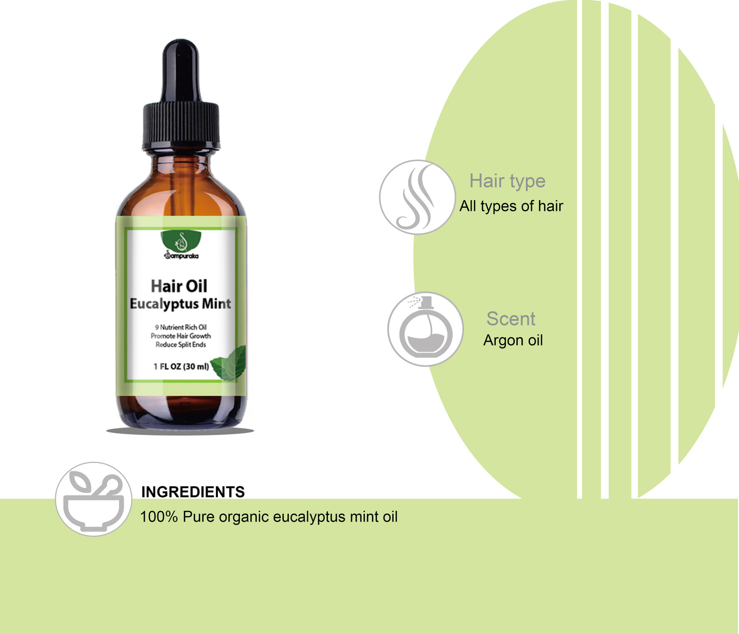 【Natural Organic Eucalyptus Mint Oil】: SAMPURAKA oil is prepared using 100% natural ingredients mostly oils. Features blend of Virgin, Argan oil, Apricot Kernal oil, Vitamin E oil, Sweet almond oil, Pumpkin seed oil, hempseed oil and grapeseed oil is scented with grade oils and premium essential oils provide nourishment strength